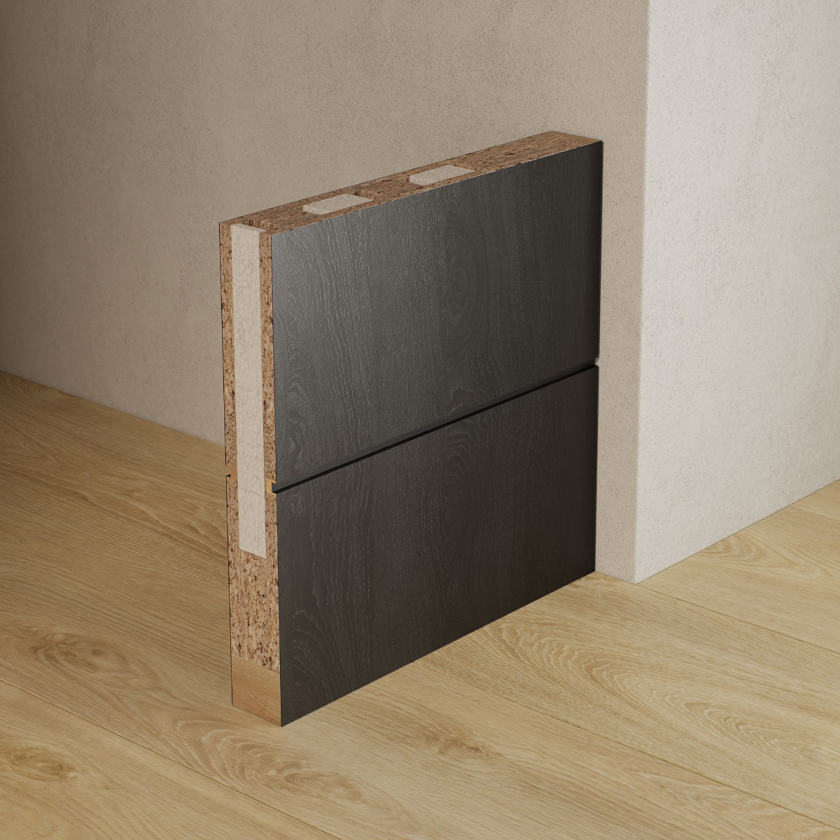 De Carve Series bestaat uit meerdere kleuren en afwerkingen met hetzelfde strakke groefpatroon. Naast Charcoal Oak zijn er varianten in Natural Oak, Puur Wit en Diep Zwart. Zo kies je makkelijk een uitvoering die past bij jouw woonstijl en interieur.