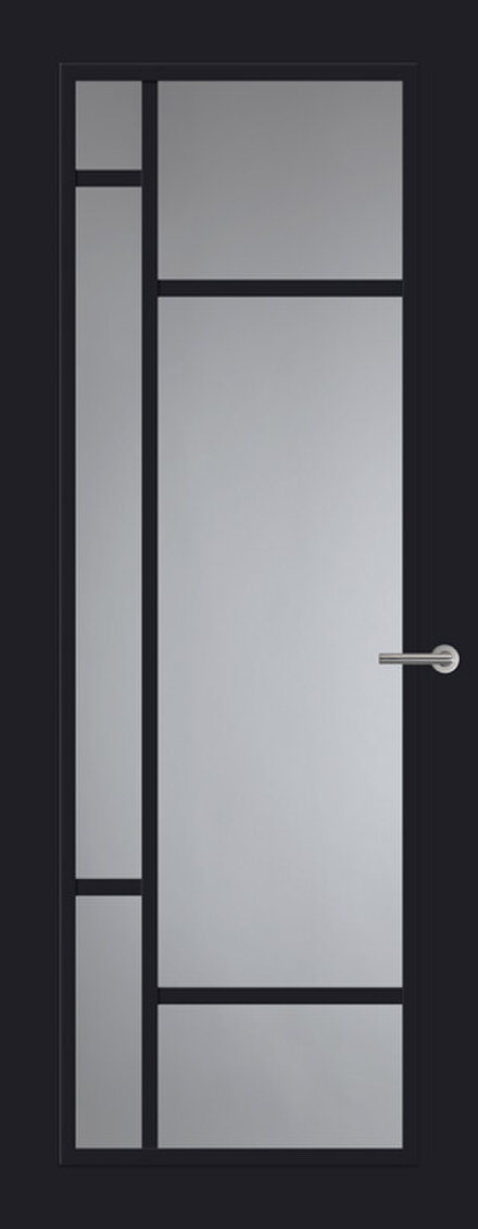 De Front FR500 glasdeur in Diep Zwart geeft je interieur een stoere en moderne uitstraling. De subtiele horizontale en verticale glaslatten creëren een strak lijnenspel dat de deur een uitgesproken karakter geeft.