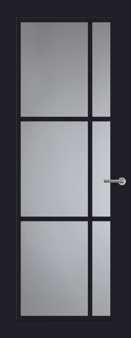 De FR504 Diep Zwart glasdeur heeft horizontale en verticale glaslatten die zorgen voor een uitgesproken, moderne look. Deze stoere deur past perfect in eigentijdse interieurs en is goed te combineren met de bijpassende lijndeur FR554 voor een strak geheel.