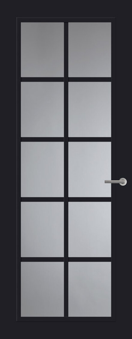 De Front FR512 in Diep Zwart is een binnendeur met een uitgesproken karakter. De horizontale en verticale glaslatten zorgen voor een modern lijnenspel, terwijl de diepe zwarte kleur de deur een robuuste, industriële uitstraling geeft.