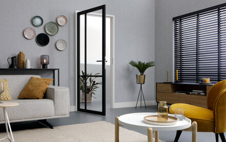 De NDB903 Diep Zwart glasdeur heeft een slanke profilering met twee smalle stijlen die zorgen voor een stoere, industriële uitstraling. Deze zwarte steellook glasdeur met luxe uitstraling past perfect bij industriële interieurs en kan mooi worden gecombineerd met de bijpassende lijndeur NDB953 zwart voor een krachtig geheel.