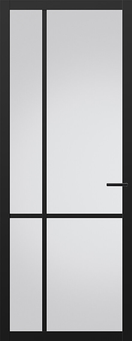 Je hebt bij deze binnendeur keuze uit vier verschillende glassoorten die elk een andere sfeer geven. Kies blank glas voor helderheid, rookglas voor extra stoerheid, satijnglas voor meer privacy of brons glas voor een warme touch bij het zwarte frame.