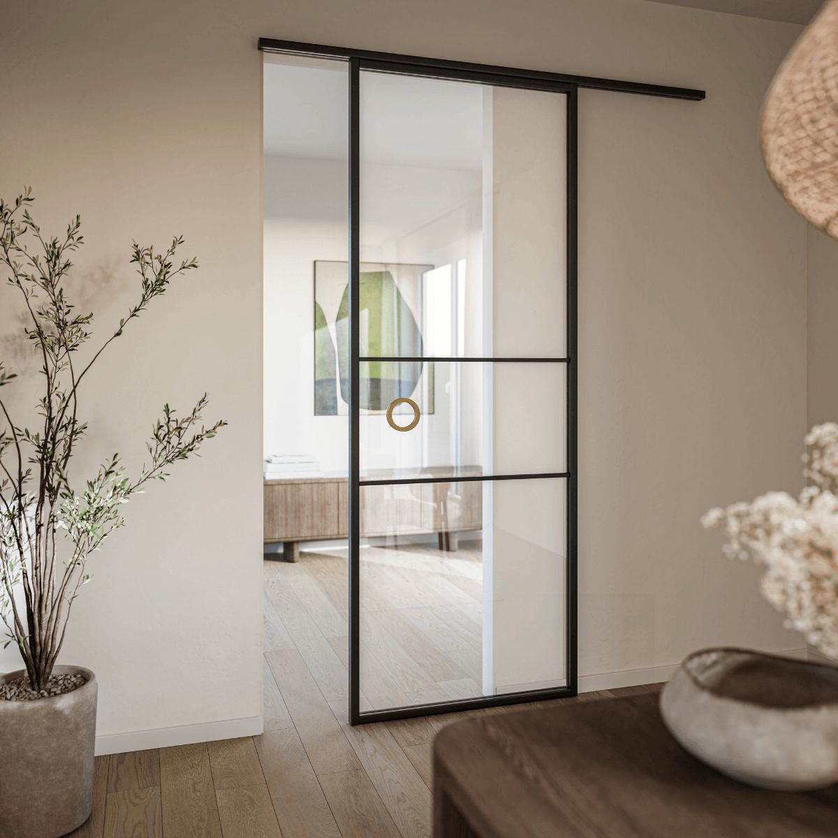De deur is uitgevoerd met blank glas. Dat laat daglicht goed door en houdt zicht tussen ruimtes mogelijk. Hierdoor is deze schuifdeur geschikt voor bijvoorbeeld een woonkamer, keuken of werkkamer.