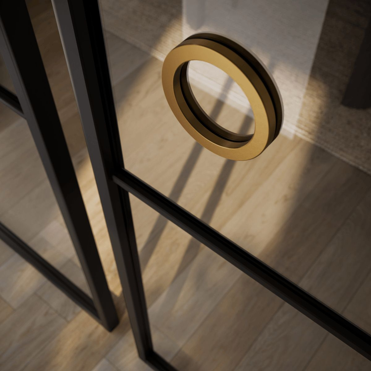 De constructie bestaat uit houten stijlen en dorpels, wat zorgt voor een stabiele deur met een prettig gewicht. De deur wordt geleverd met een voorgemonteerde ring in mat messing die dient als schuifkom. Voor een complete set kies je het bijpassende schuifdeursysteem Lima XS in zwart of aluminium.